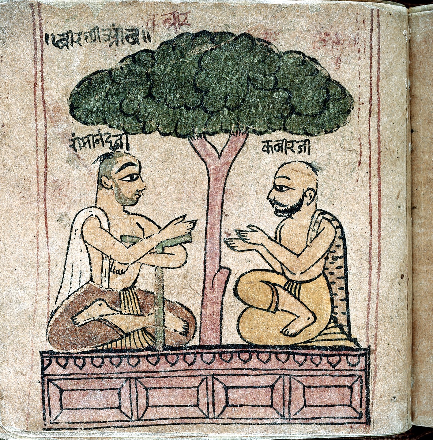 Vi har i dag få manuskripter med Kabir-materiale fra før 1700, og sørasiatiske manuskripter med tidlige former for hindi fra før 1600 er i det hele tatt sjeldne. Bildet over er fra MS Hindi 371, ett av Wellcome Collections samling av nærmere tusen manuskripter med tidlig hindi. Illustrasjonen viser Kabir, til høyre, i samtale med Ramananda, til venstre, tradisjonelt ansett som Kabirs guru. Manuskriptet inneholder en rekke sanger og tekster av ulike helgener og diktere, inkludert Kabir, og ble nedskrevet i 1715. Dets relativt tidlige dato og uvanlig mange illustrasjoner betyr at manuskriptet er meget sjeldent. Dessverre ble det kjøpt på auksjon hos Steven’s i London i 1915 sammenbundet med en helt annen tekst, og begge manuskriptene er attpåtil kledd i et tynt løkpapir. Dermed er det i dag ikke mulig å utskille de to manuskriptene og gjenopprette deres opprinnelige orden uten å risikere å ødelegge de sjeldne illustrasjonene.