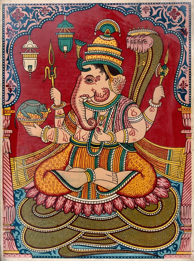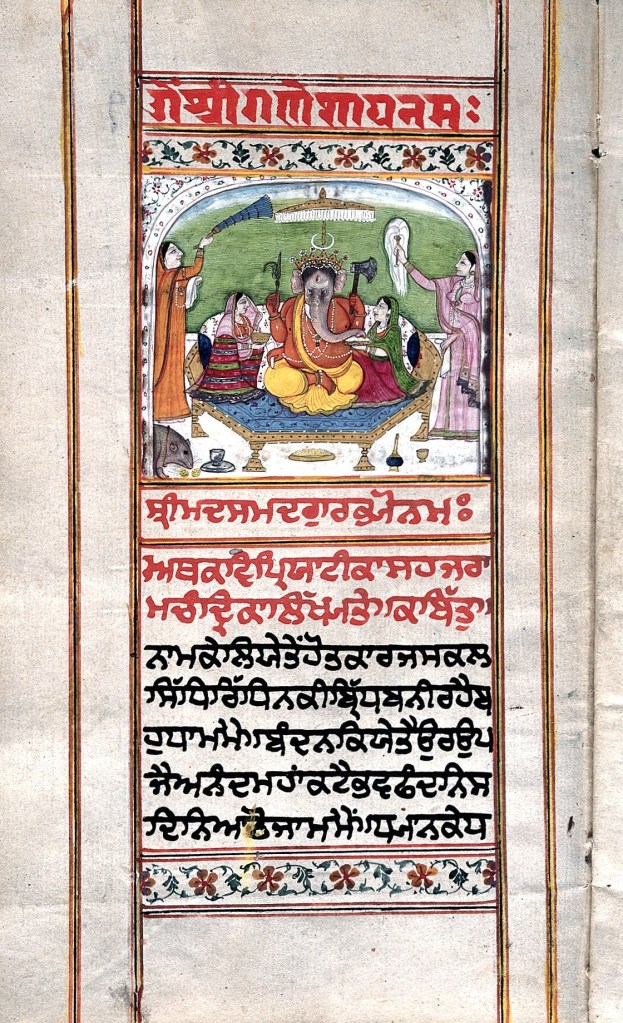 I de fleste manuskripter fremstår frasen som en ren formalitet. Men vi har også eksempler på mer kreative løsninger, som regel i manuskript bestilt av folk med dype lommer. Wellcome Collections MS Panjabi 259 vier halve forsiden til en overdådig illustrasjon av Ganesh som holder hoff og oppvartes. Ingenting er overlatt til tilfeldighetene; nederst til venstre ser vi at musen Ganesh tradisjonelt rir som en hest, også slapper av og mesker seg på kongelig vis.