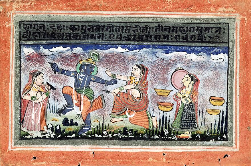 Detalj fra Wellcome MS Hindi 197, en gouache-illustrasjon av Krishna i full gang med å leke holi. Wellcome Collection, CC BY 4.0.
