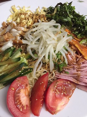 Ellen: Hva med å prøve en klassisk japansk sommerrett i ferien? Hiyashi chūka, eller “kald kinesisk mat”, er en veldig populær nudelrett som går hånd i hånd med den varme japanske sommeren. Retten er utrolig lett å lage – det eneste som gjøres er å koke nudler og avkjøle dem i kaldt vann, for så å servere dem med en rekke forskjellige toppinger. Vanlige toppinger varierer fra region til region, men den klassiske versjonen toppes med tomatbiter og strimler av egg, skinke og agurk. I tillegg hører det med en enkel saus laget av en blanding av risvin, soyasaus, sukker og sesamolje. Chūka betyr kinesisk mat, og retten kan kanskje sies å være inspirert av en kinesisk versjon av samme rett, eller en slags fusjon mellom de to. Den japanske versjonen har røtter til det tidlige 1900-tallet, og er visst kjent i Kina som “japanske nudler”. Retten er også å regne som et representativt ord (fūbutsushi) for måneden juli, og 7. juli er til og med utnevnt til hiyashi chūkaens dag. Det finnes i tillegg en nasjonal klubb for hiyashi chūka-elskere.