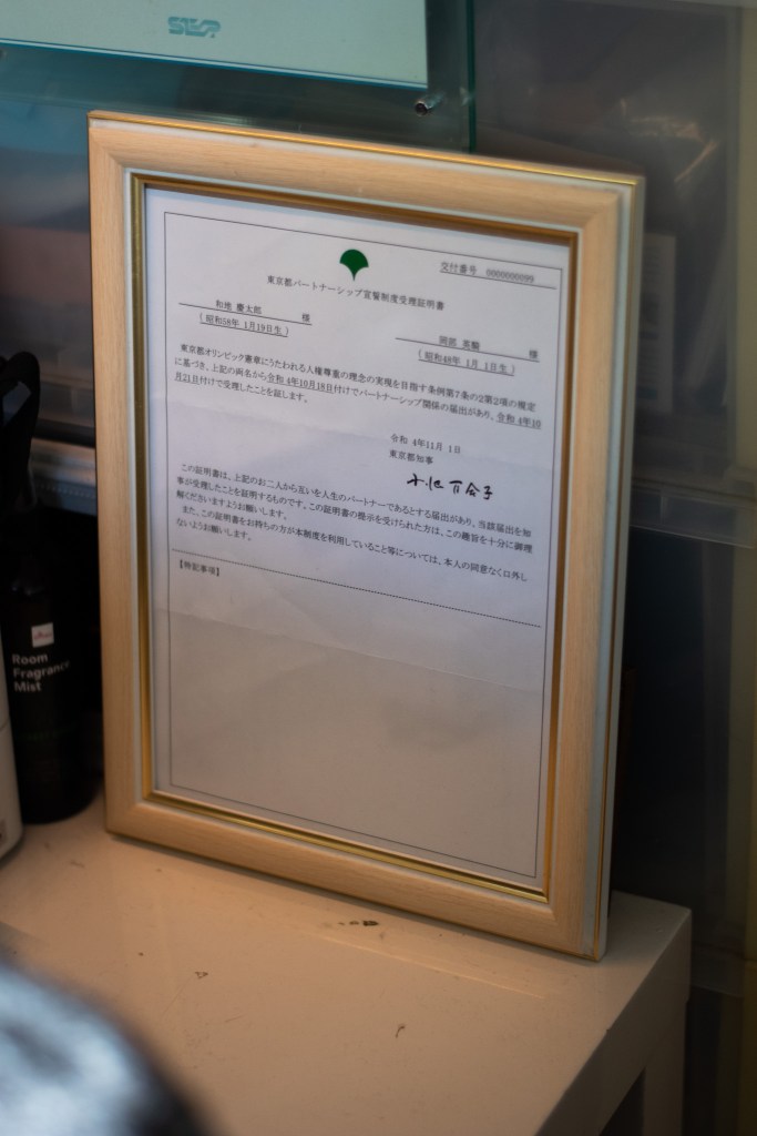 Wachi og partneren er tidlig ute. De blir par nummer 99 til å søke om sertifisering. Første dagen systemet trer i kraft, er det offisielt. I en liten ramme på kommoden hans står det signerte beviset på at de i lovens navn er partnere. Et bevis som gir dem tilgang på noen offentlige og private tjenester som ellers ville vært utilgjengelige – men kun en brøkdel av hva ekteskapsrettigheter ville gitt.